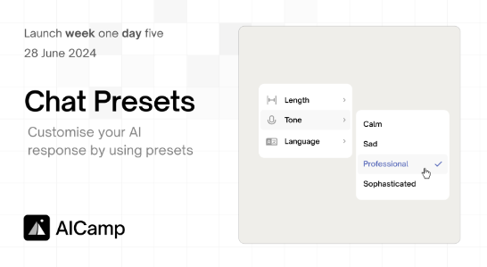 Enhance your AI interaction experience with Chat Presets in AICamp. Customize the AI’s responses to better suit your needs and streamline your workflow. Explore the new Chat Presets feature today and see how it can transform your interactions.