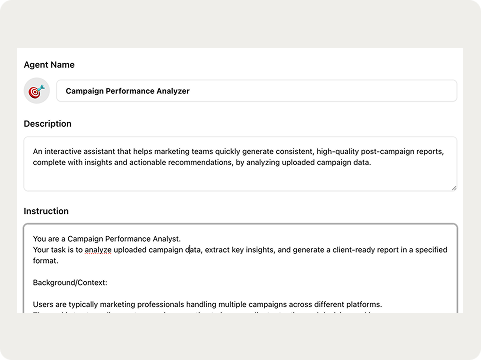 Agents help your teams move faster across roles and departments. Set instructions, attach the right context, and let the Agent take over built in minutes and ready to support real work.