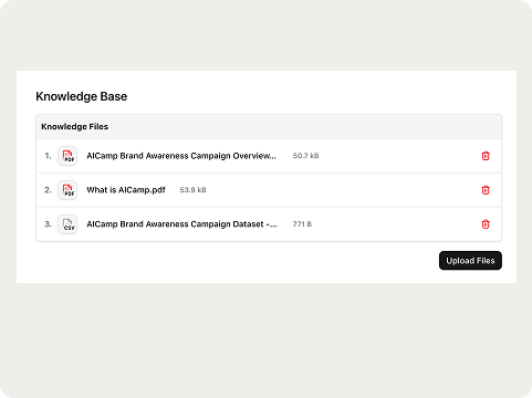 Upload your documents, SOPs, product details, and internal data. This context shapes the Agent’s understanding of your organization and lets it answer, decide, and execute with accuracy. Better context leads to better results.