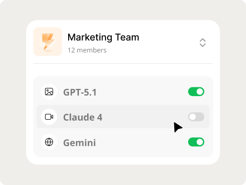 Set up 1–2 groups (like Marketing or Product), assign teammates, and enable specific models and agents for each group with granular, role‑based controls.